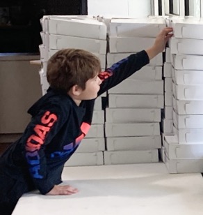 To the left, Braxton Boysen helps place recently folded boxes in the stacks which would be used for the finished pies.