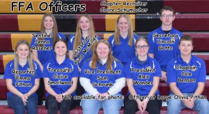 Front Row: Jon Wimmer-Advisor, Nina McMillen-Historian, Claire Smallwood-Treasurer, Sam Schrunk-Vice-President, Alex Wonder-President, Claire Schumacher-Chapter Recruiter, Emma Pithan-Reporter, Cole Benson-Chaplain, Lincoln Gotto-Secretary. Missing from the photo-Jenna Rosener-Sentinel, Olivia Pithan-Officer at Large.