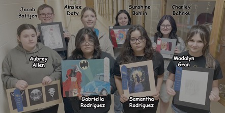 Blue ribbon (first place in their categories) winners were the following: For DrawingMadalyn Gran and Jacob Bottjen; PhotographySamantha Rodriguez; Digital Art and non ceramic SculptureAubrey Allen.