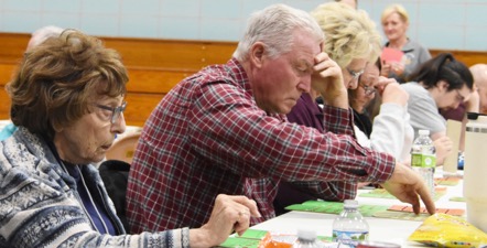 Mary Ortner, James Else, and Crista Else concentrate on their Bingo cards.